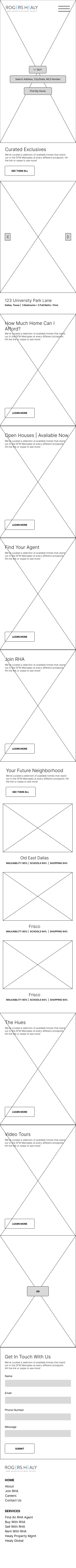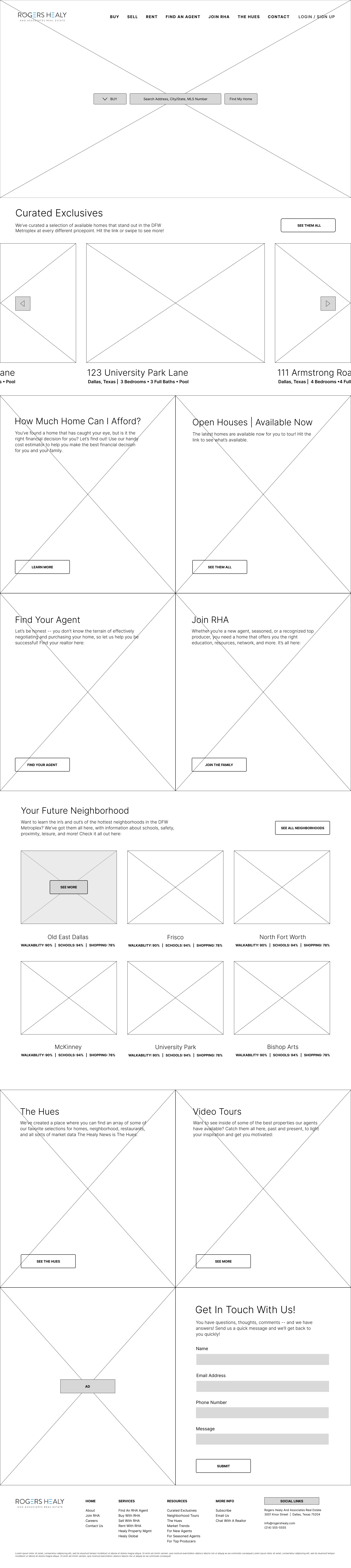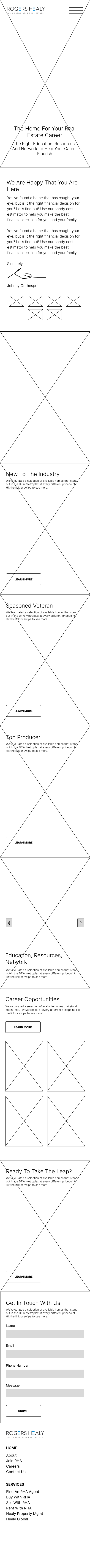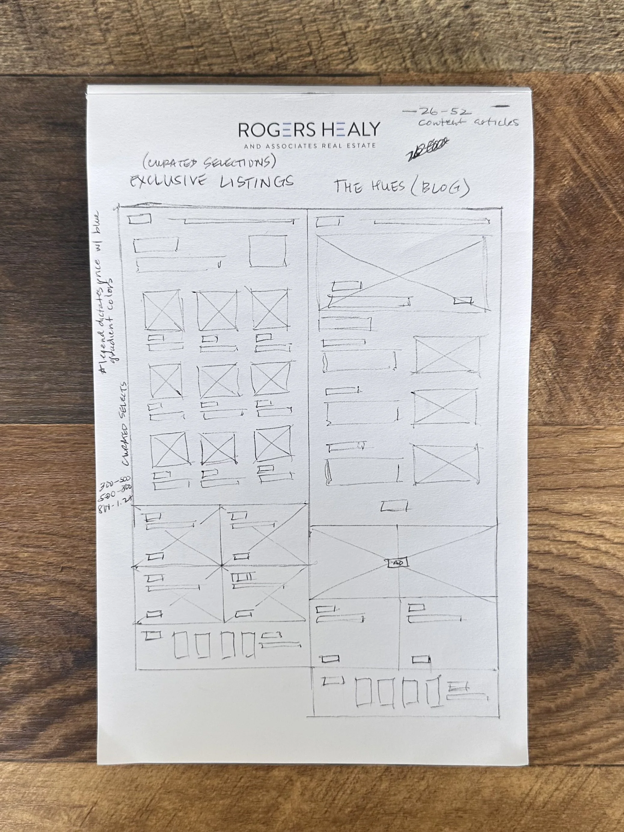 Following learned UI/UX principles, and after several marketing and design meetings, I launched into handrawn wireframes of what a potential layout could look and function like. The goal was to elevate the original website experience by giving homebuyers and sellers easy access to the information they needed, give agents a place to either join the brokerage or show their work, and build a hub for all of RHA’s content. My personal goal was to help design a beautiful, engaging experience that was smooth and easy to use.