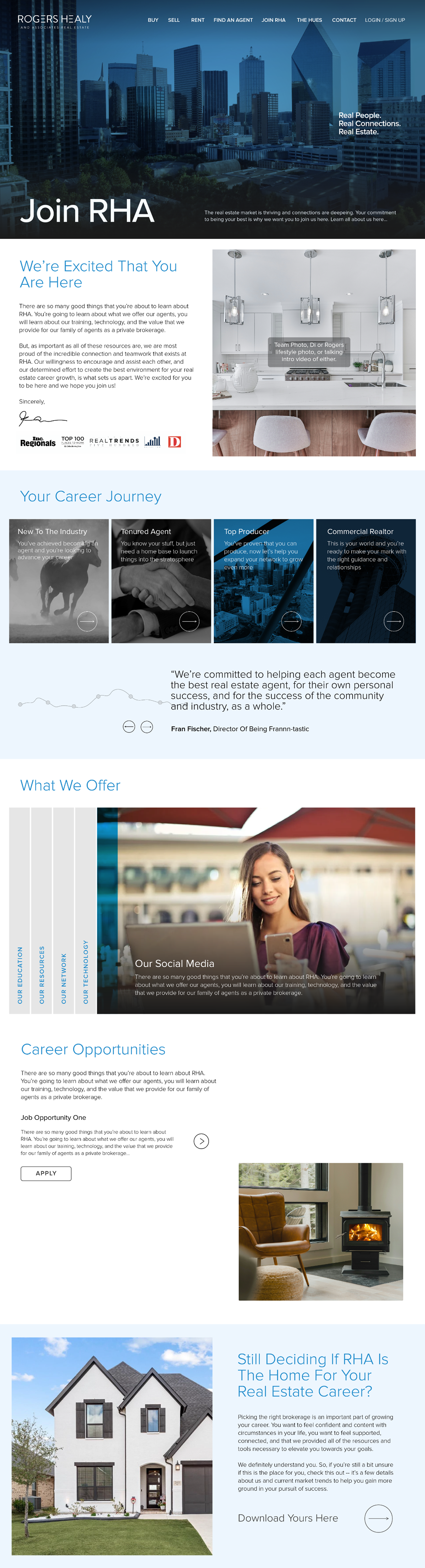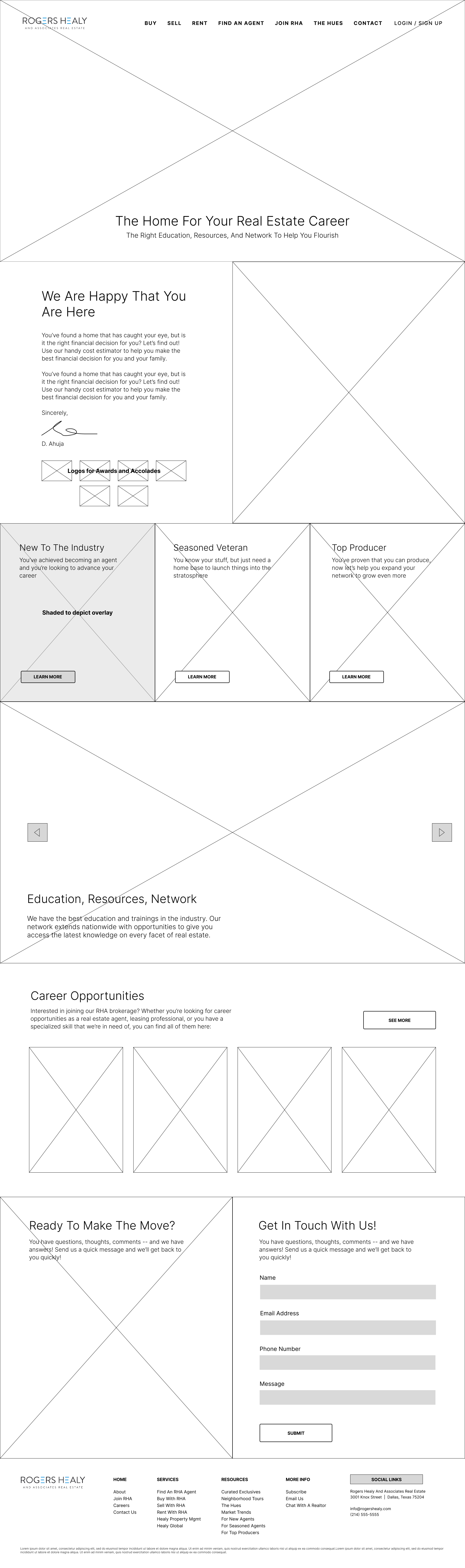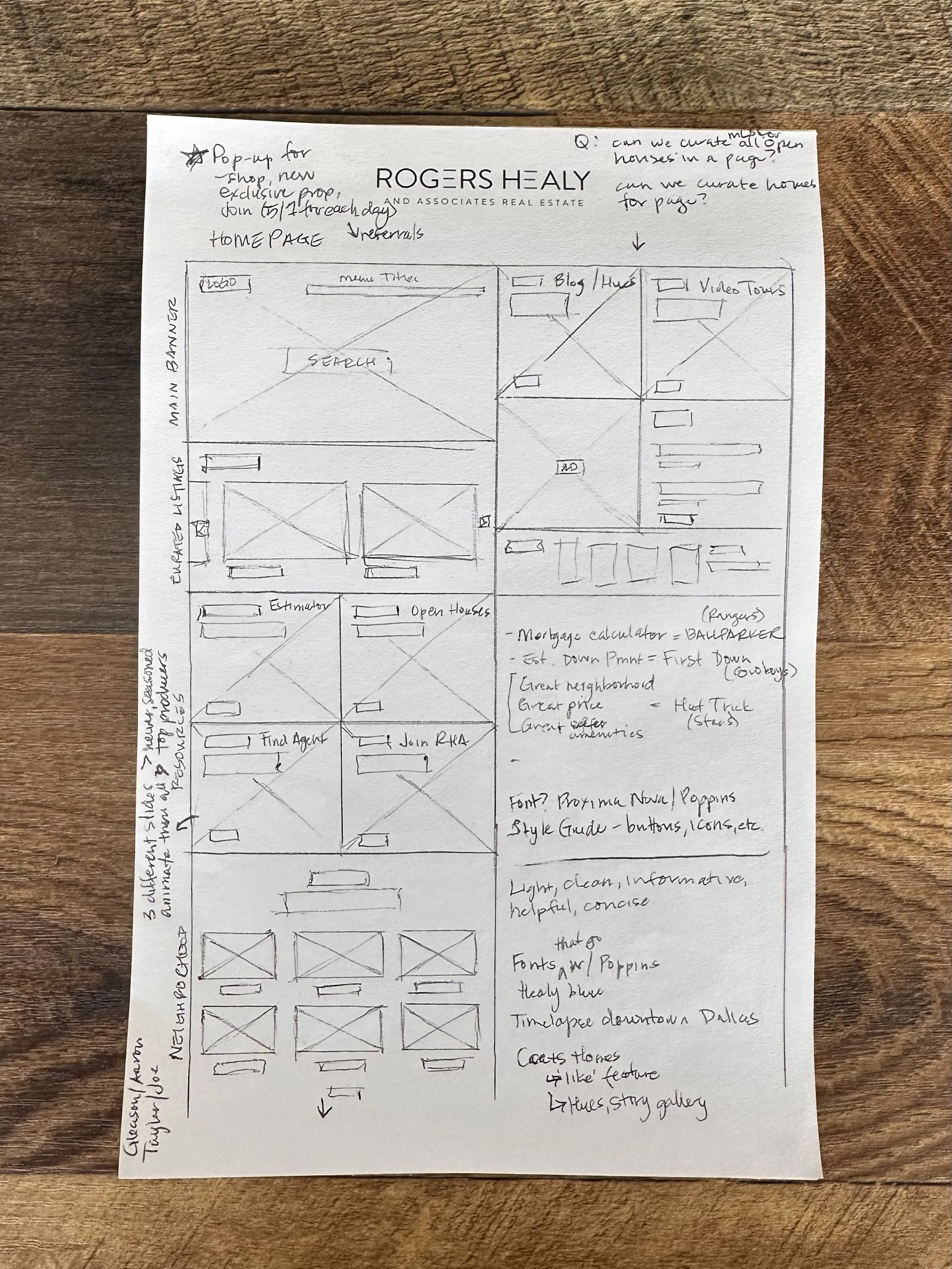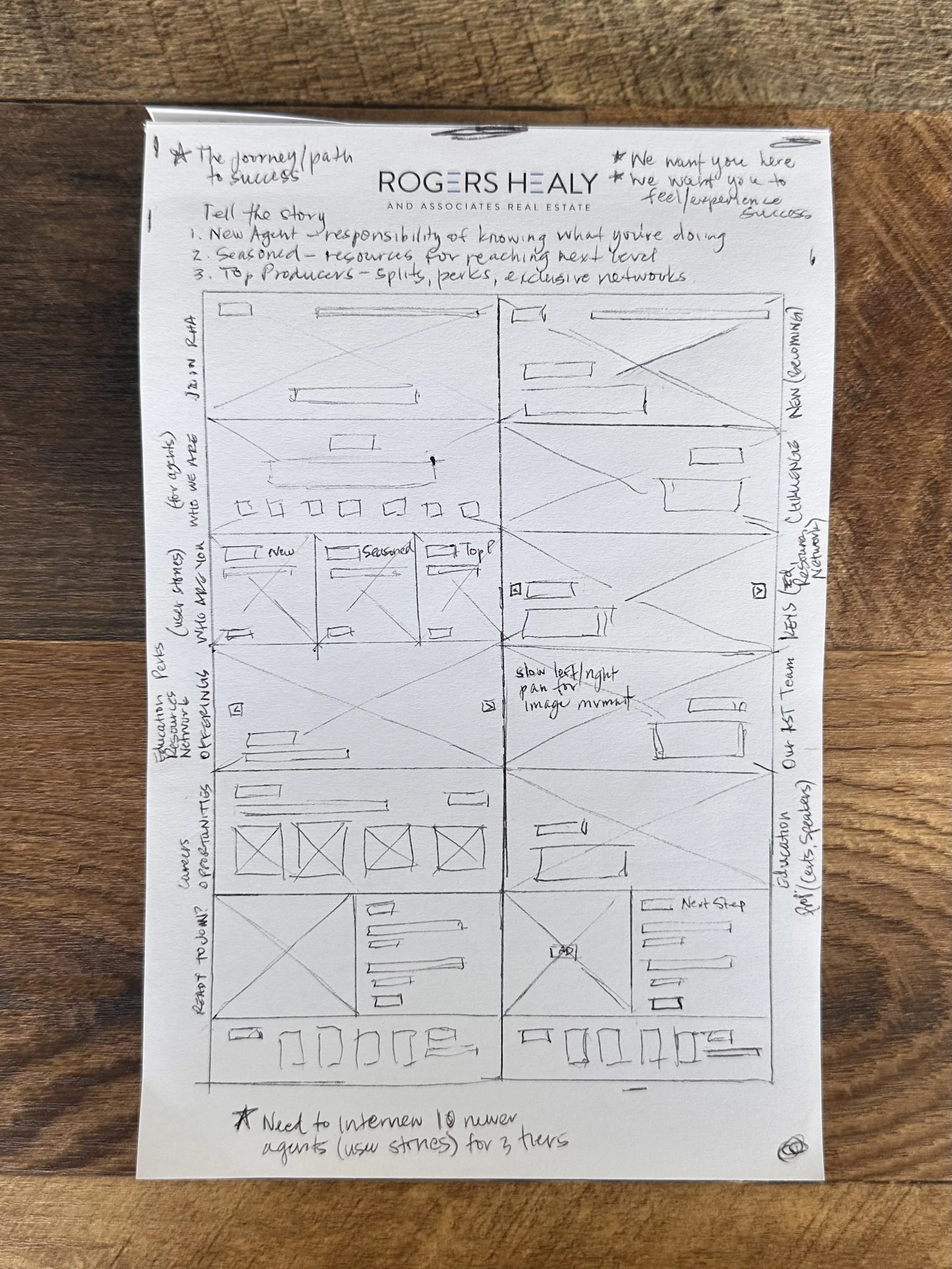 Following learned UI/UX principles, and after several marketing and design meetings, I launched into handrawn wireframes of what a potential layout could look and function like. The goal was to elevate the original website experience by giving homebuyers and sellers easy access to the information they needed, give agents a place to either join the brokerage or show their work, and build a hub for all of RHA’s content. My personal goal was to help design a beautiful, engaging experience that was smooth and easy to use.
