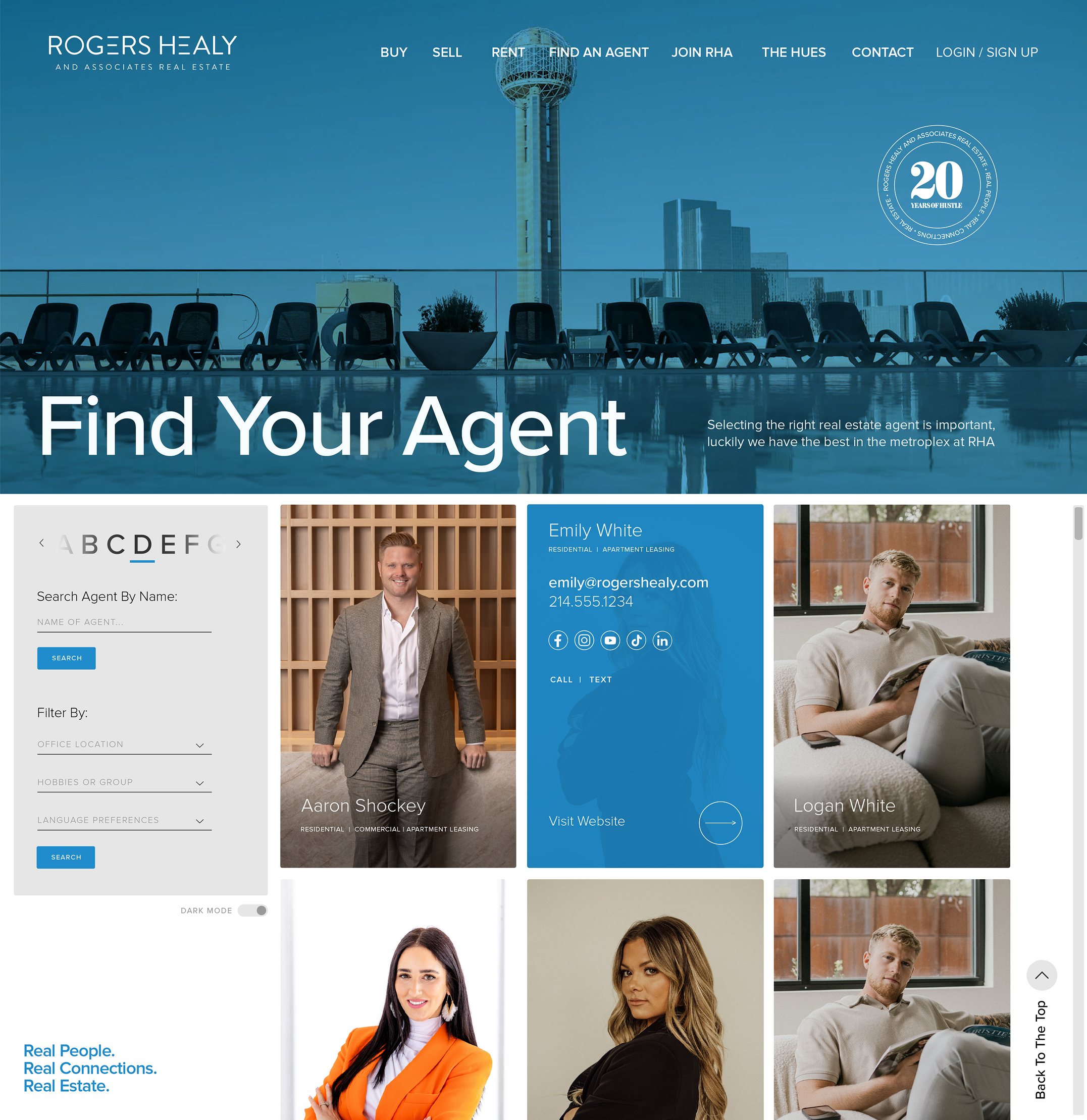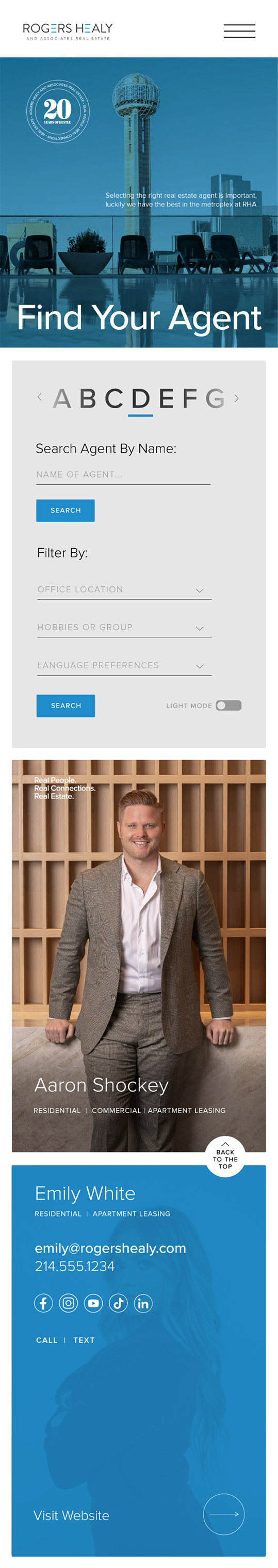 I put together the following layout for desktop and mobile, that I feel would really give the user a more engaging experience when searching for the realtor they are needing. Drop-down filter options, a revolving alphabetical search, light animation with the seal in the upper right hand corner and other elements to curate their experience. An interface that would not only be elevated, but provided the user with immediate access to needed information. For more on this, plus a few notes, hit the Figma link here.
